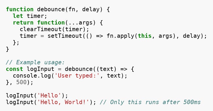 This function creates a closure that tracks the timer. Each call clears any pending timeout and resets it. When the user stops typing (no new calls within the delay period), the original function is invoked. As a result, only the last input triggers the action. In our example usage, calling logInput("Hello") followed by logInput("Hello, World!") ensures that only the second call runs after 500 milliseconds.