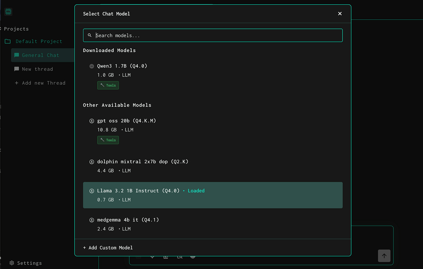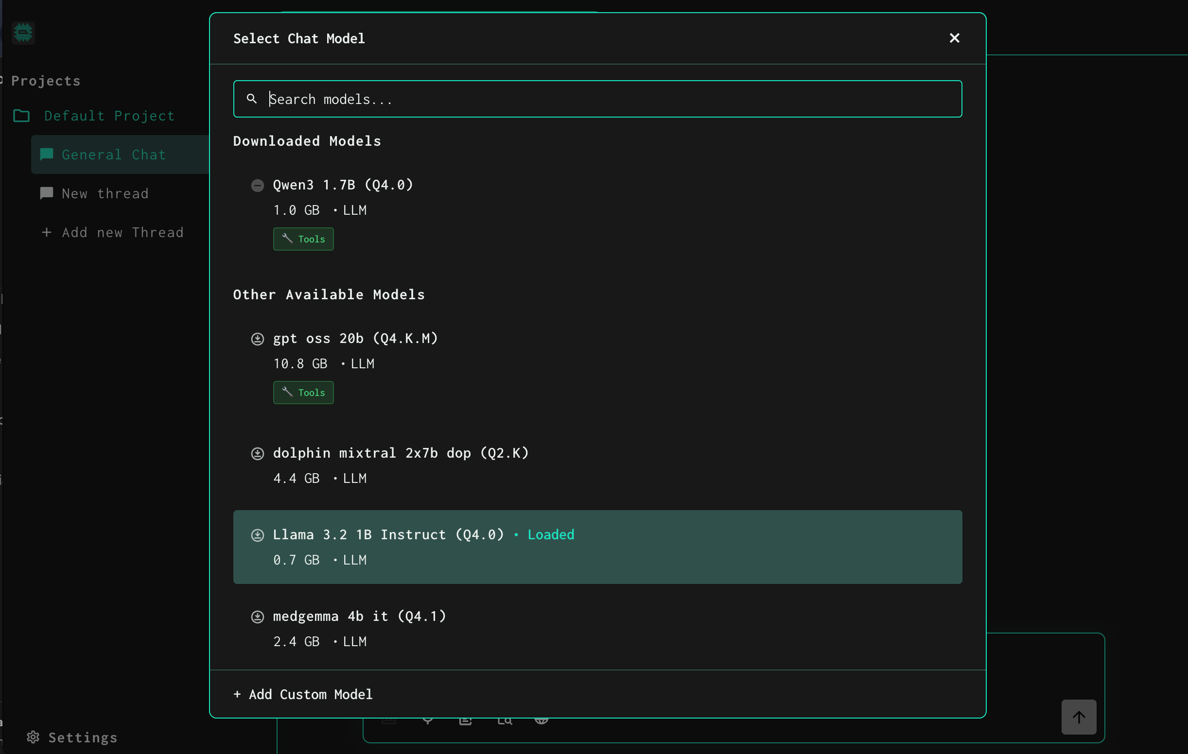 You can Download and choose models as per your needs from the Project setting Also you can configure other chat related settings