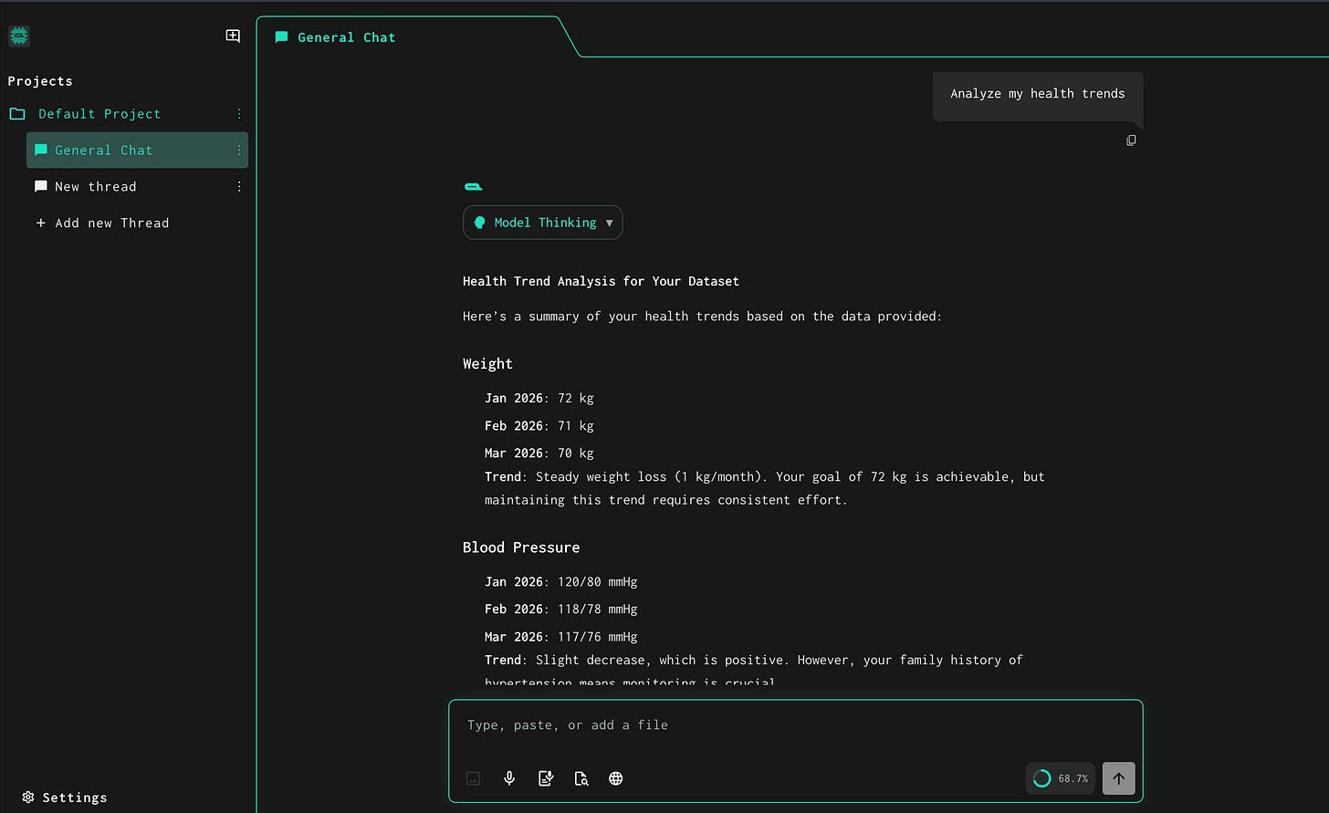 By the end of this tutorial you will be able to upload a personal health dataset and ask AI questions like: